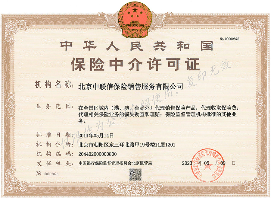 •  业务范围:在全国区域内(港、澳、台除外)代理销售保险产品;代理收取保险费;代理相关保险业务的损失勘查和理赔;保险监督管理机构批准的其他业务。
